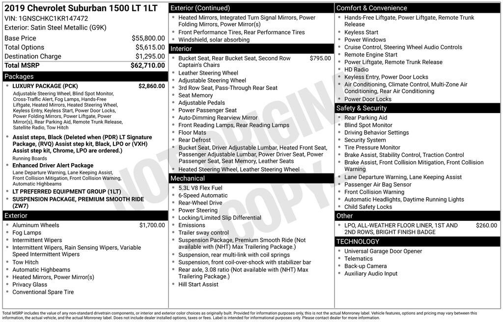 Satin Steel Metallic 2019 Chevrolet Suburban LT 4D Sport Utility RWD 6-Speed Automatic Electronic with Overdrive EcoTec3 5.3L V8